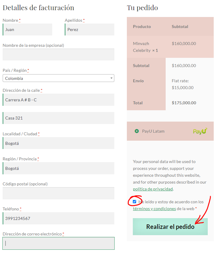 - Verás una página como la siguiente, donde debes poner todos tus datos reales, ten en cuenta que si vives dentro de Bogotá es necesario que pongas el Código Postal, si no conoces el tuyo puedes colocar el número 110000, si vives fuera de Bogotá el Código Postal no es necesario, así que puedes dejar el campo en blanco. Una vez llenado el formulario debes aceptar los «Terminos y Condiciones» de nuestro sitio, y finalmente darle clic en el botón «Realizar Pedido».